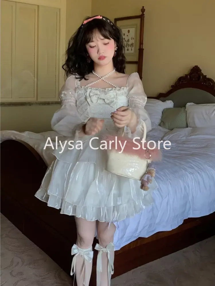 Japanese Sweet Fairy Lolita Dress Women White Mesh Elegant Princess Dress Female Bow Casual Evening Party Dress Summer 2023 Slim