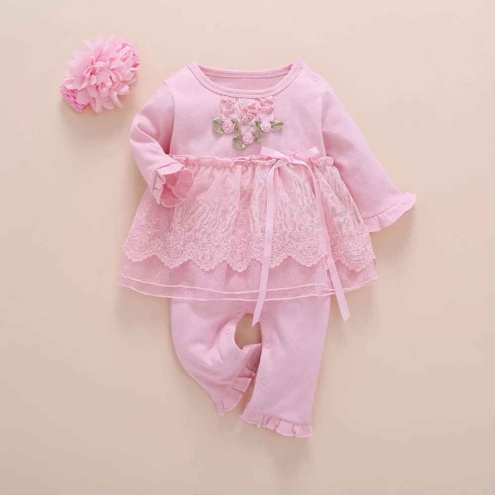 Newborn Baby Girl Clothes Fall Cotton Lace Princess Style Baby Jumpsuit 0-3 Months Infant Romper With Socks Headband ropa bebe