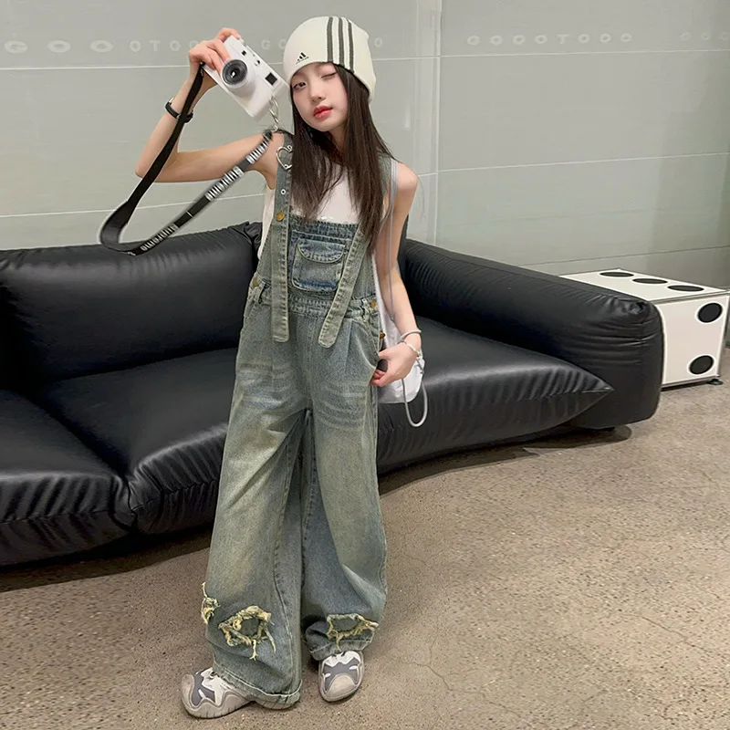 Overalls for Kids Pink Loose Casual Wide Leg Jeans Teenage Girls Jumpsuit Fashion All-match 12 13 14 Years Children Trousers