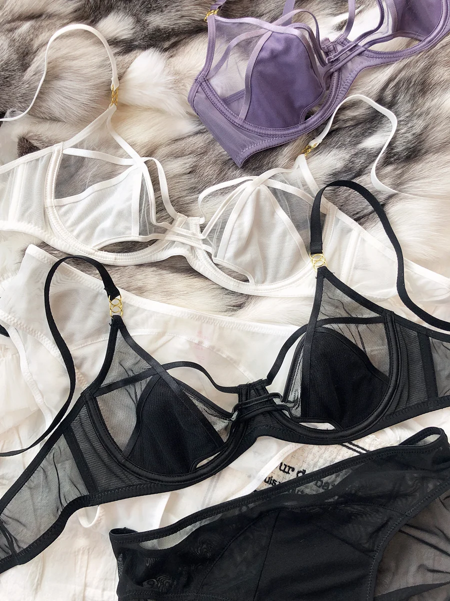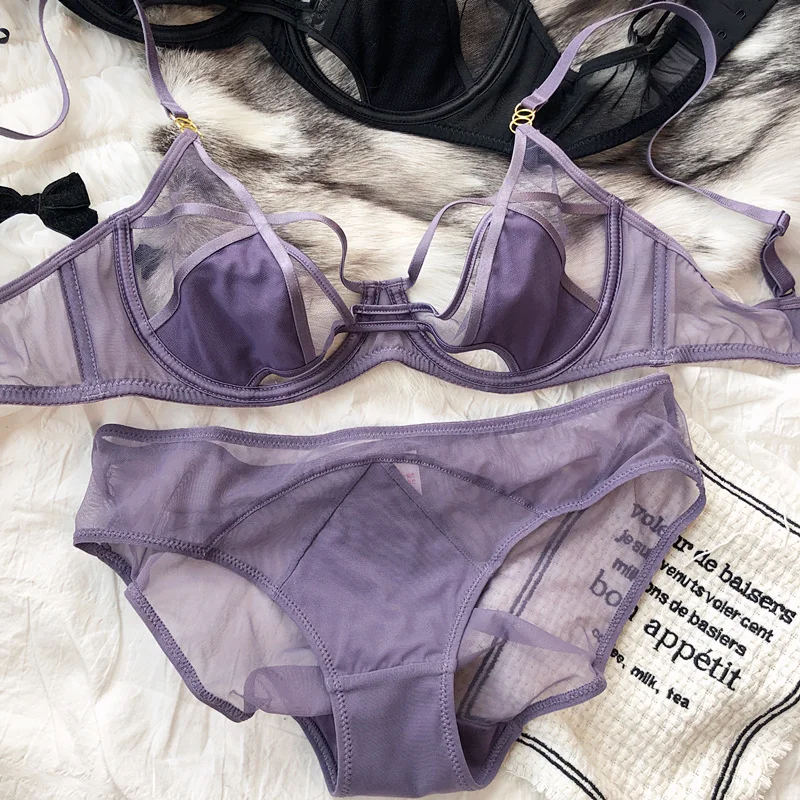 Sexy Hollow Lingerie Set French Ultra Thin Women Bra Summer Breathable Purple Plus Size 95CD Cup Underwear Push Up Brassiere