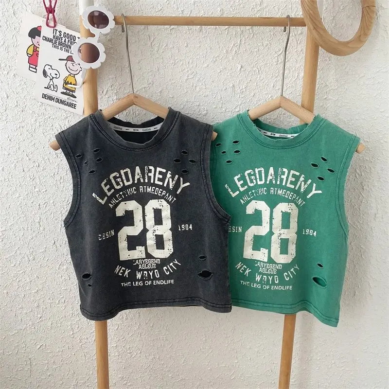 Summer Handsome Boys New Worn Black Pure Cotton Sleeveless Perforated T-shirt Loose Style Baby Tank Top