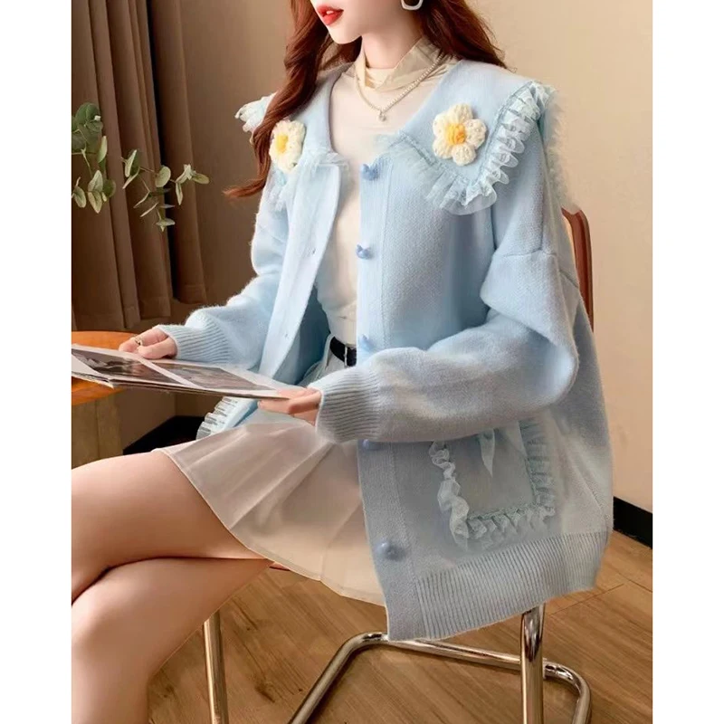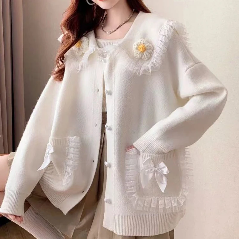 Sweet Peter Pan Collar Pockets Bow Lace Cardigan Sweaters Female Clothing 2024 Autumn Winter New Loose Knitted Young Style Tops