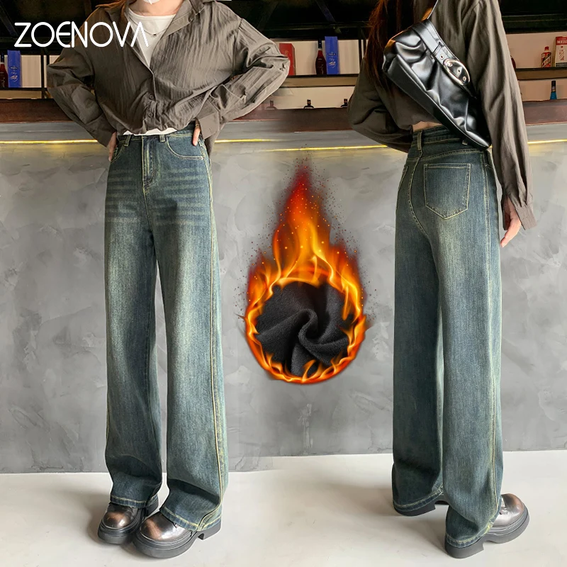 ZOENOVA Autumn Winter Classic Y2K Fleece Jeans Women Fashion Elegant Lady Casual Versatile Loose Plus FleeceDenim Wide Leg Pants
